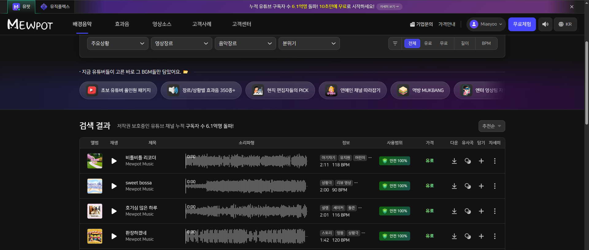 ๊ทธ๋ฆฌ๊ณ BGM๋ฟ ์๋๋ผ ํฐํธ, ์๋ง ํ ํ๋ฆฟ, ํธ๋์ง์ , AI ์ด๋ฏธ์ง๊น์ง ์ฝํ ์ธ ์ ์์ ํ์ํ ๊ฑฐ์ ๋ชจ๋ ์์ฐ์ ์ ๊ณตํด์ฃผ๋, ํธ์งํ ๋ ์์ค ํ์ ์๊ฐ์ด ์ค์ด๋ค๊ณ ํ๋ฆฌํฐ๊ฐ ํ ์ฌ๋ผ๊ฐ๋๋ผ๊ณ ์.